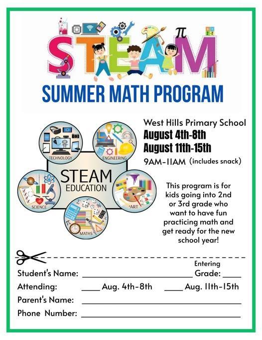 West Hills Primary students that are entering 2nd and 3rd grade and want to have fun practicing math with STEAM (science, technology, engineering, art, math) education, are encouraged to register for our Summer Math Program!